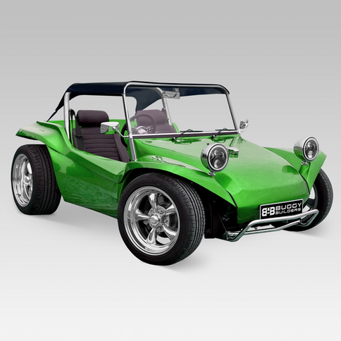 Lime Green Metal Flake - Black flow-coat. Independent rear suspension plus adjustable front beam with chrome nudge bar. American Racing Torq Thrust II - 5x4.75” PCD. Front 16x7 Rear 18x10. Tyres: Front 195/50 R16. Rear 275/40 R18. 1641cc, Twin Carburettors - EMPI 34 ICT. BB Clubsport Classic seats and custom rear seat. Sombrero Bikini soft top. Vintage Speed Black Mamba Gear Shifter with Black Base.